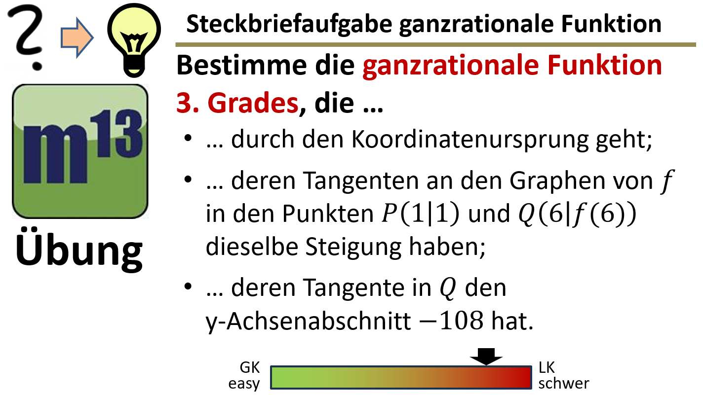 m13v0858  In diesem Video wird eine anspruchsvollere Steckbriefaufgabe behandelt. Du sollst den Funktionsterm einer ganzrationalen Funktion 3. Grades aufstellen. Anders als bei vielen Steckbriefaufgaben müssen hier auch komplexere Bedingungen aus der Funktionsbeschreibung identifiziert werden. | Skript zum Download | auf teilen